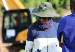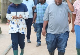 Mkurugenzi Manispaa ya Kinondoni Bi. Hanifa Suleiman Hamza akiwa na timu ya Wataalamu wa Manispaa ya Kinondoni alipotembelea Daraja la Magereza katika Kata ya Wazo kujionea uharibifu uliotokana na mvu...